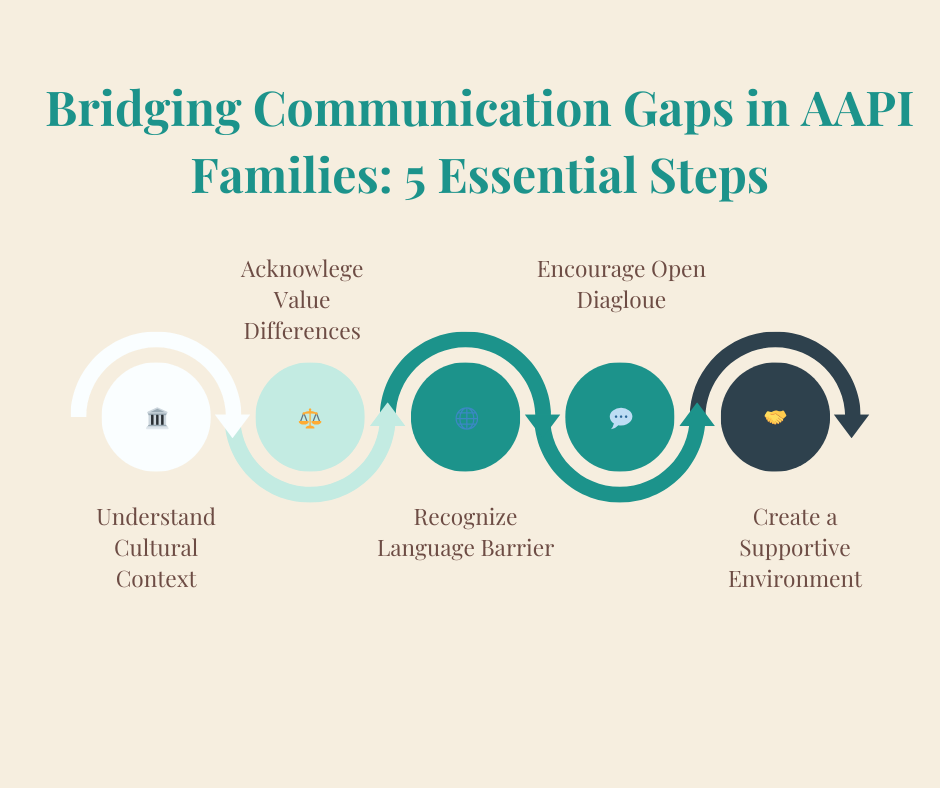 This visual diagram shows the five steps for bridging AAPI family communication gaps discussed in this blog post.
